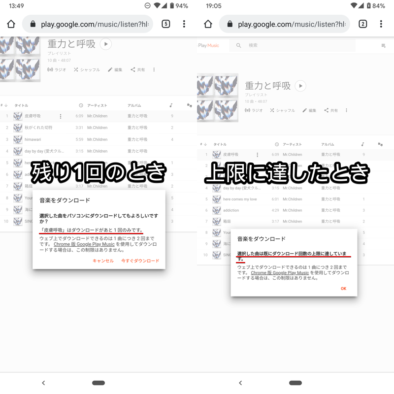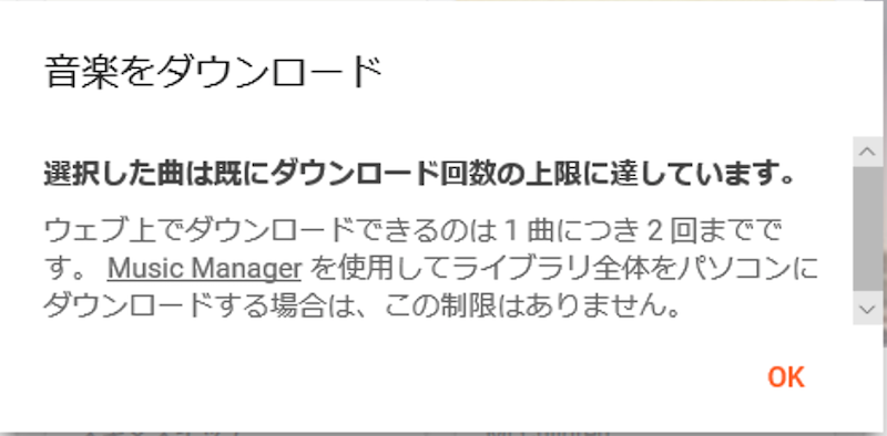 選択した曲は既にダウンロード回数の上限に達しています。 ウェブ上でダウンロードできるのは1曲につき2回までです。 Music Managerを使用してライブラリ全体をパソコンにダウンロードする場合は、この制限はありません。