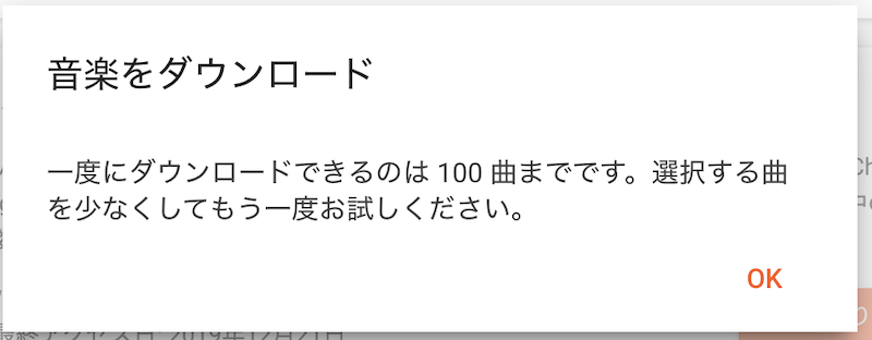 一度にダウンロードできるのは100曲までです。 選択する曲を少なくしてもう一度お試しください。