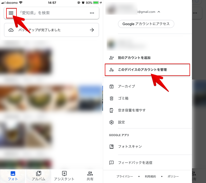 打开 Google 相册并转到菜单管理此设备的帐户选择,