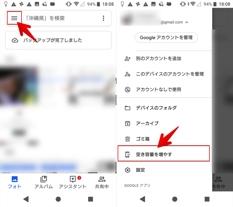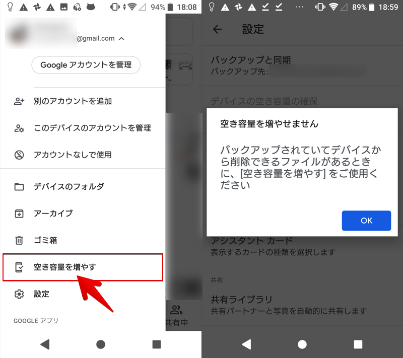 空き容量を増やせません バックアップされているデバイスから削除できるファイルがあるときに、[空き容量を増やす]をご使用ください