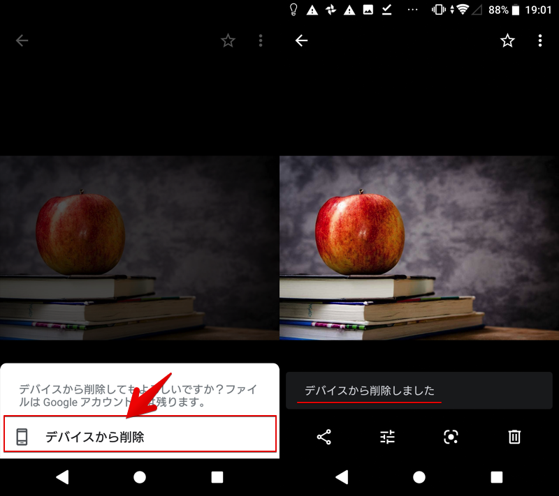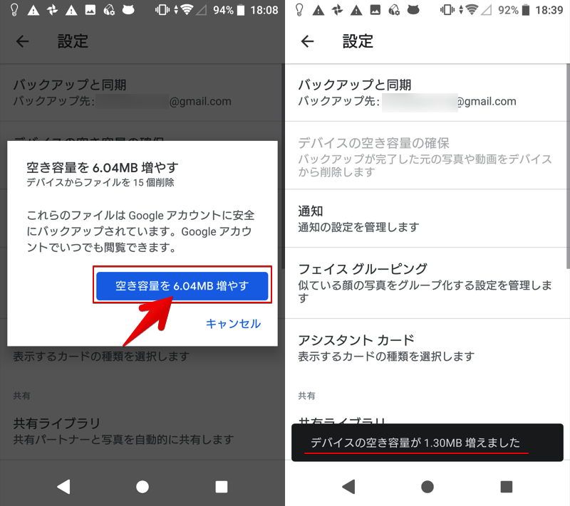 Google Photos 的备份已完成,智能手机上剩余的文件列表将自动显示。删除(增加可用空间)执行。