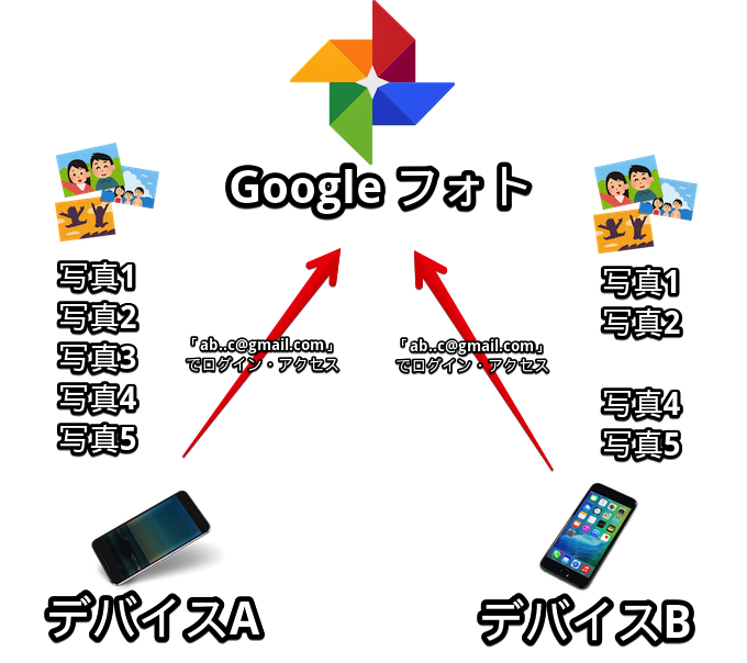 即使我使用同一帐户访问 Google 相册,照片 3 也不会显示在设备 B 上。