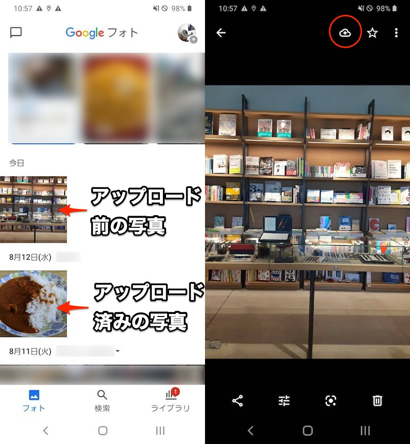 (左) 还显示上传前的照片 (右) ☁上传前的照片显示备份图标