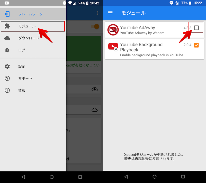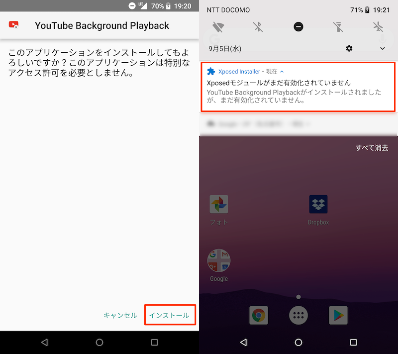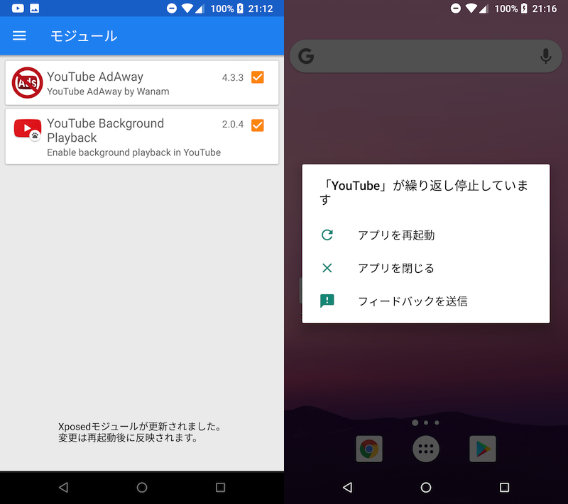 (左)安装 YouTube 相关模块的示例(右)安装后立即显示通知