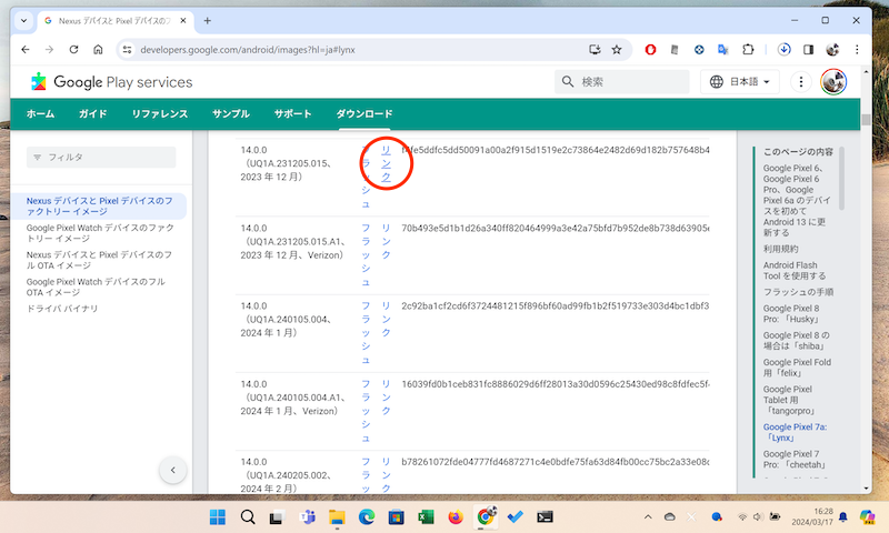 选择 Pixel 7a 内部版本号 14.00 (UQ1A.231205.015) 的示例
