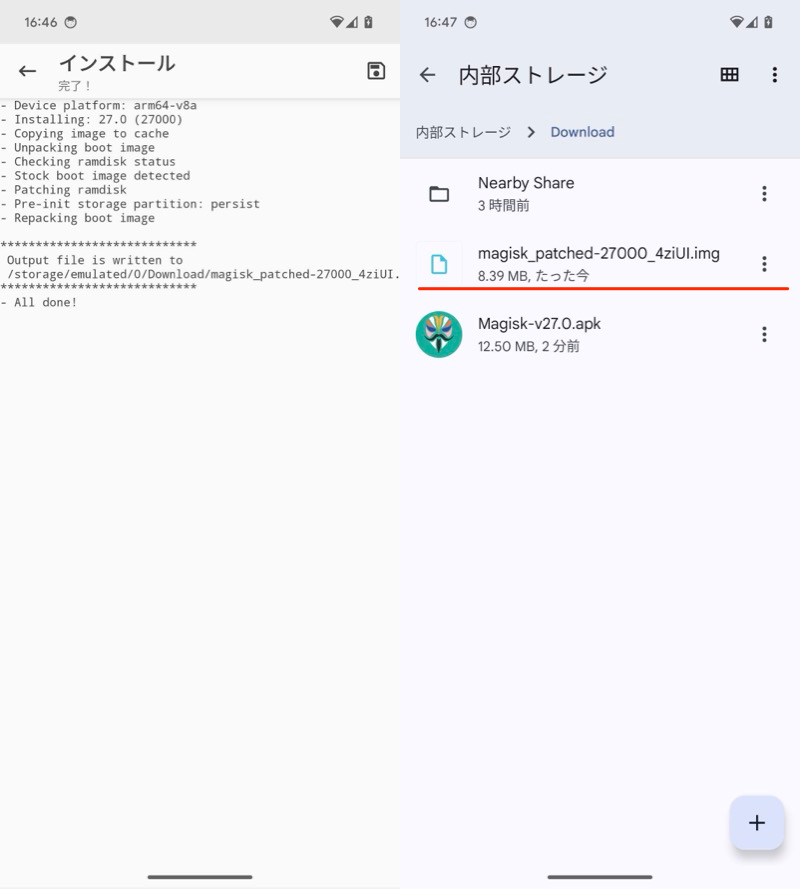 名为 magisk_patched-xxx.img 的文件将保存在内部存储的“Download”文件夹中。