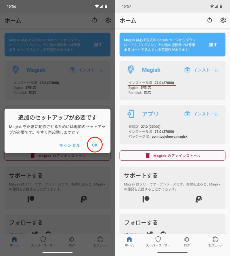 (左)需要额外的设置(右)如果显示“已安装”,则您已成功root。