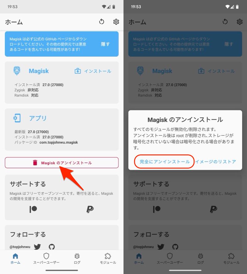 从 Magisk 的顶部屏幕卸载 Magisk→完全卸载并选择。