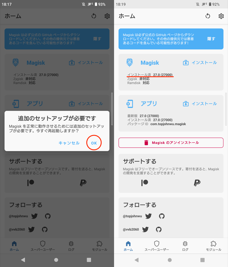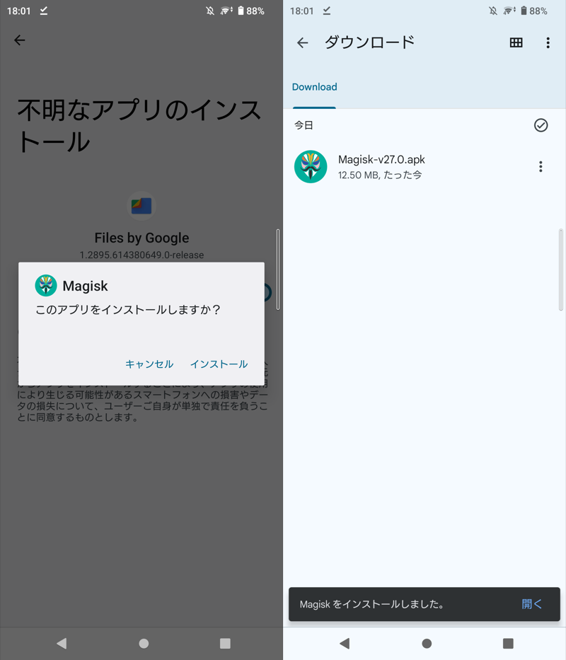追加のセットアップが必要です Magiskを正常に動作させるためには追加のセットアップが必要です。 今すぐ再起動しますか?