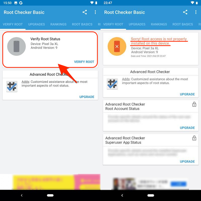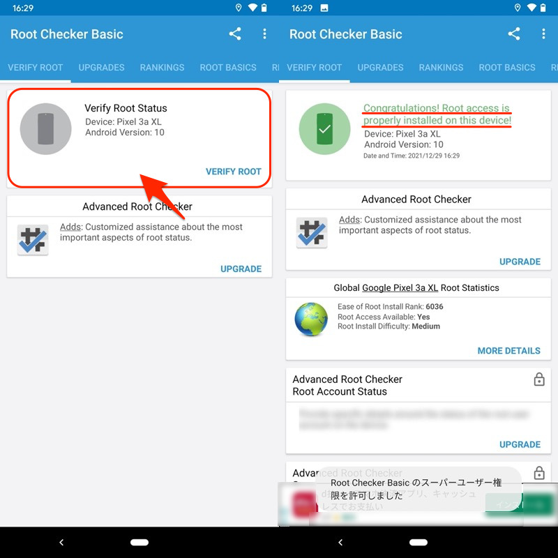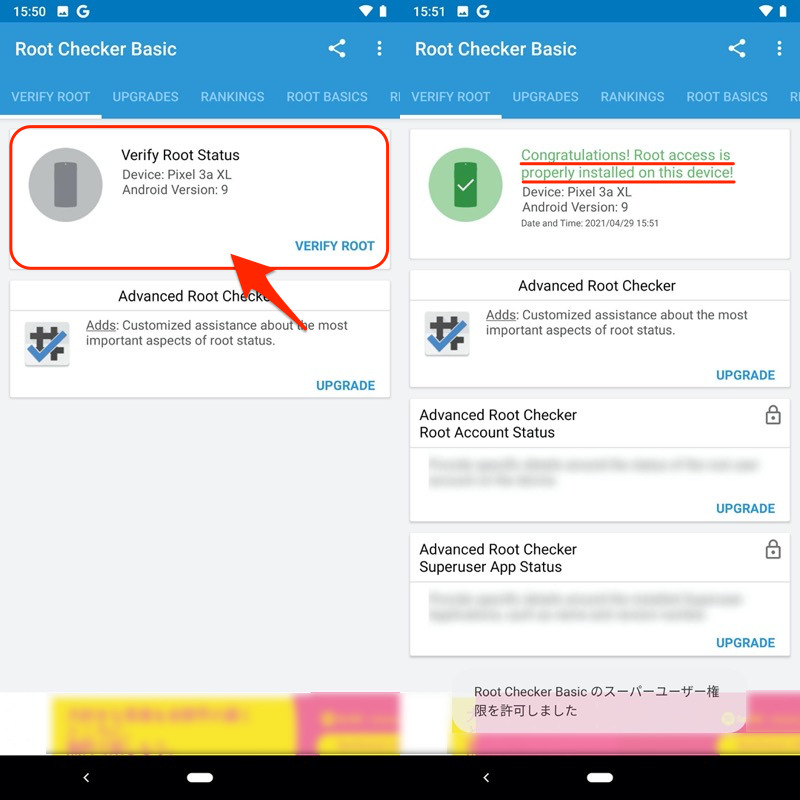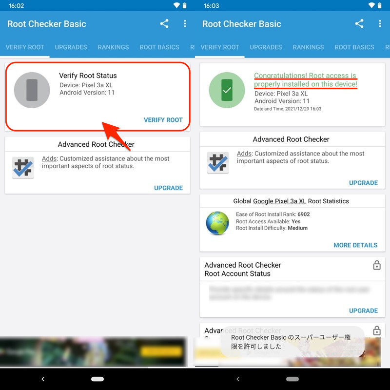 Pixel 3a XL (Android 11) 成功生根的示例。