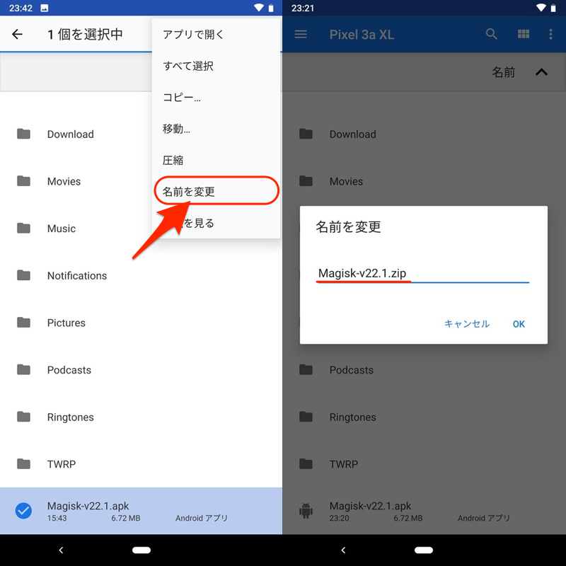 将内部存储中保存的apk文件的名称更改为“Magisk-v22.1.zip”,并将扩展名更改为Zip。