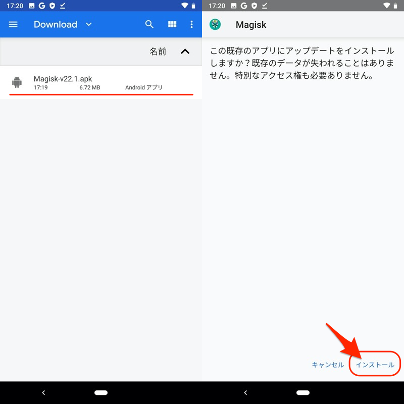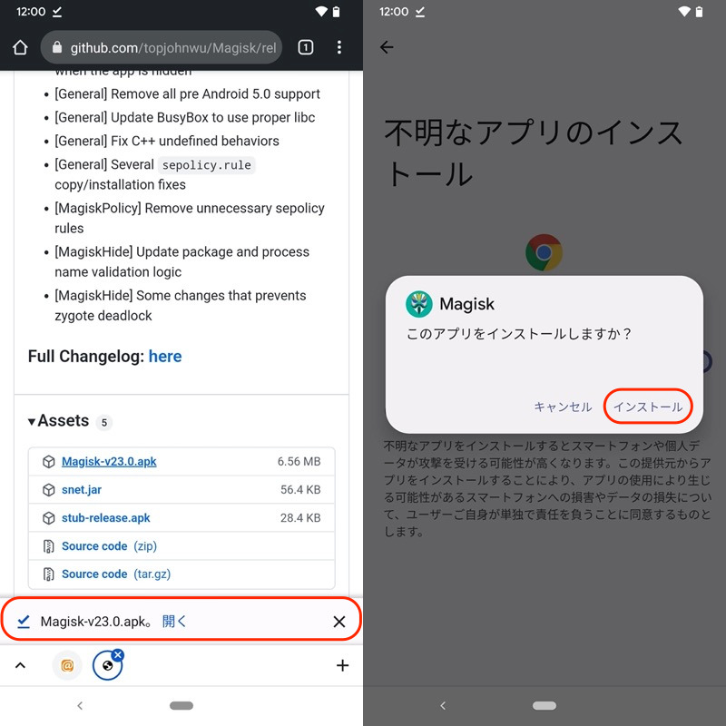 从 apk 文件手动安装 Magisk 应用程序的示例。