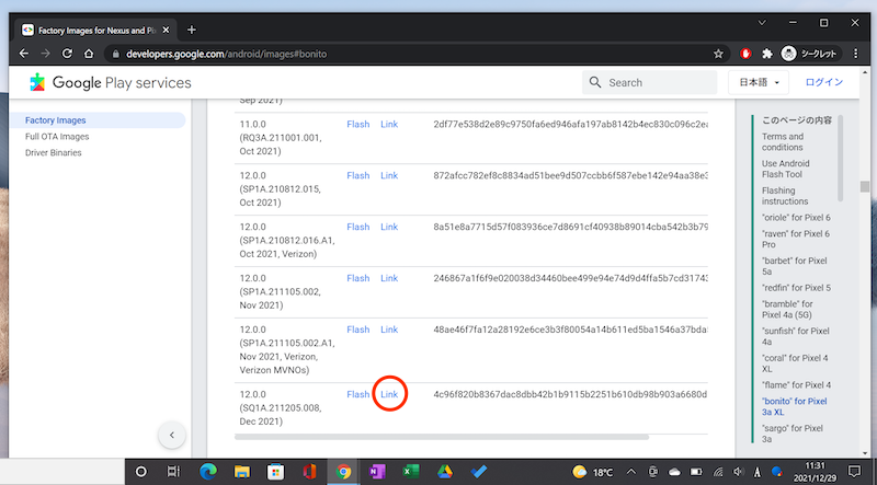 选择 Pixel 3a XL 内部版本号 12.0.0 的示例(SQ1A.211205.008,2021 年 12 月)。