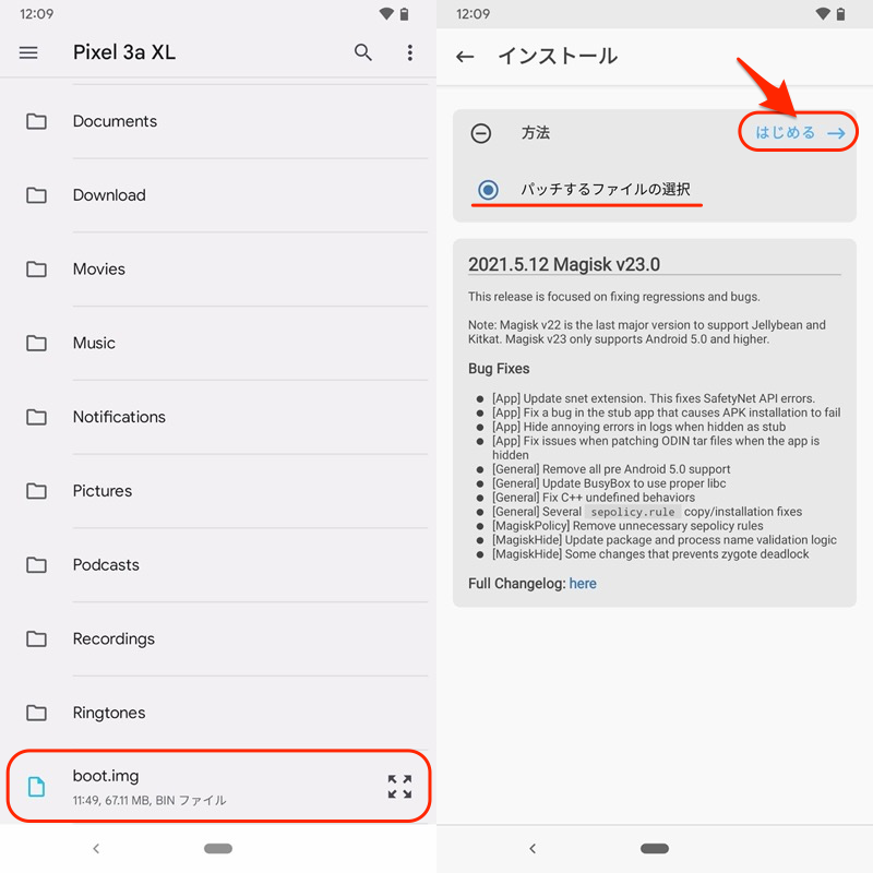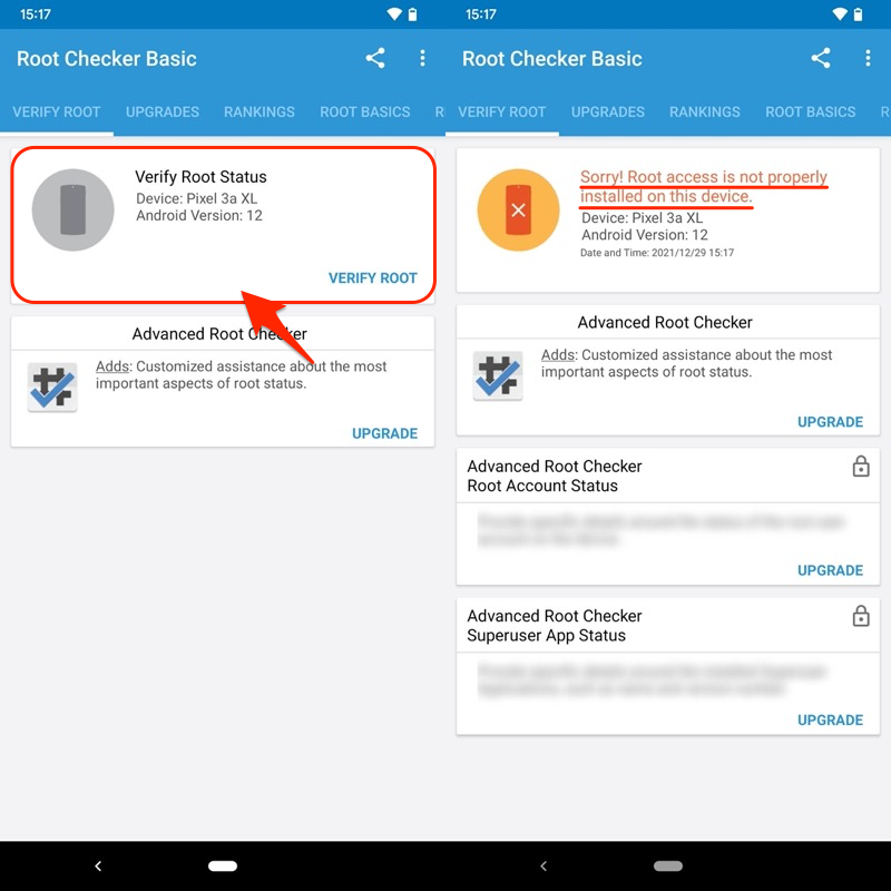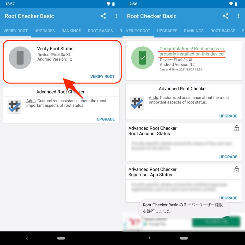 Pixel 3a XL (Android 12) 成功生根的示例。