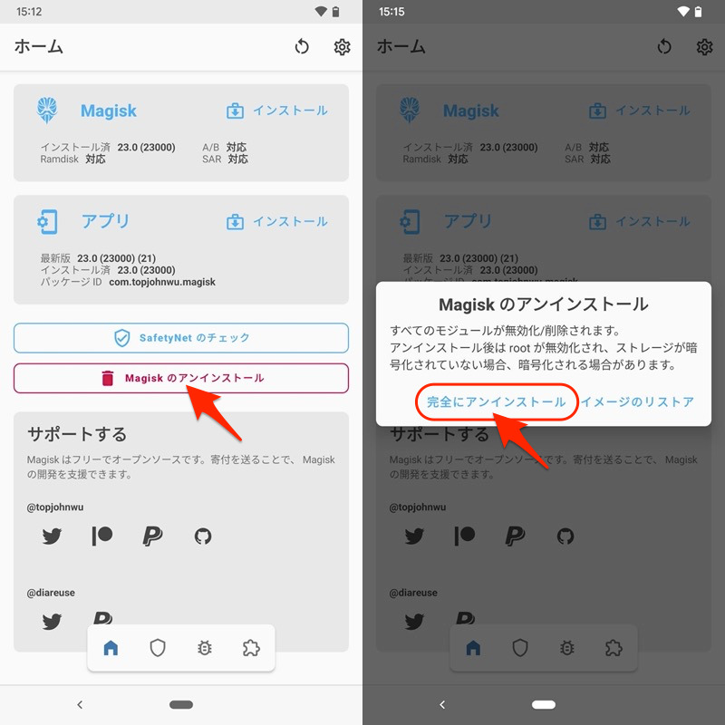 从 Magisk 的顶部屏幕卸载 Magisk→完全卸载并选择。
