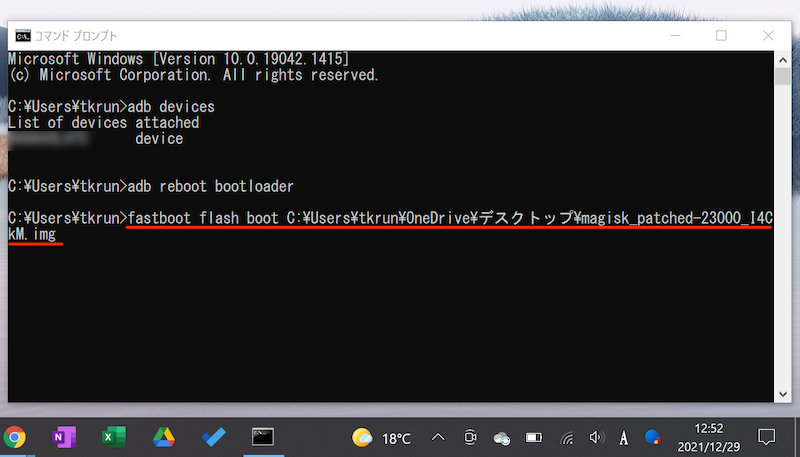 ▼使用适用于 Android 9 的 img 文件(例如 twrp-3.5.2_9-0-bonito.img)适用于 Android 11/12 的示例