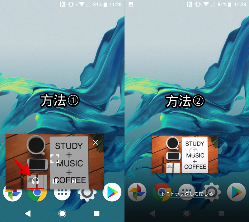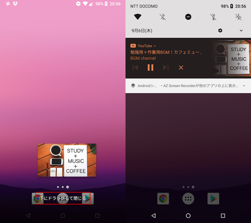 如果通过拖放删除小窗口,正在播放的视频将显示在通知区域中,并在后台继续播放。