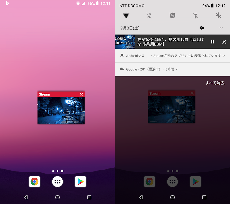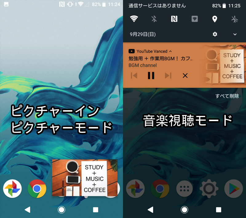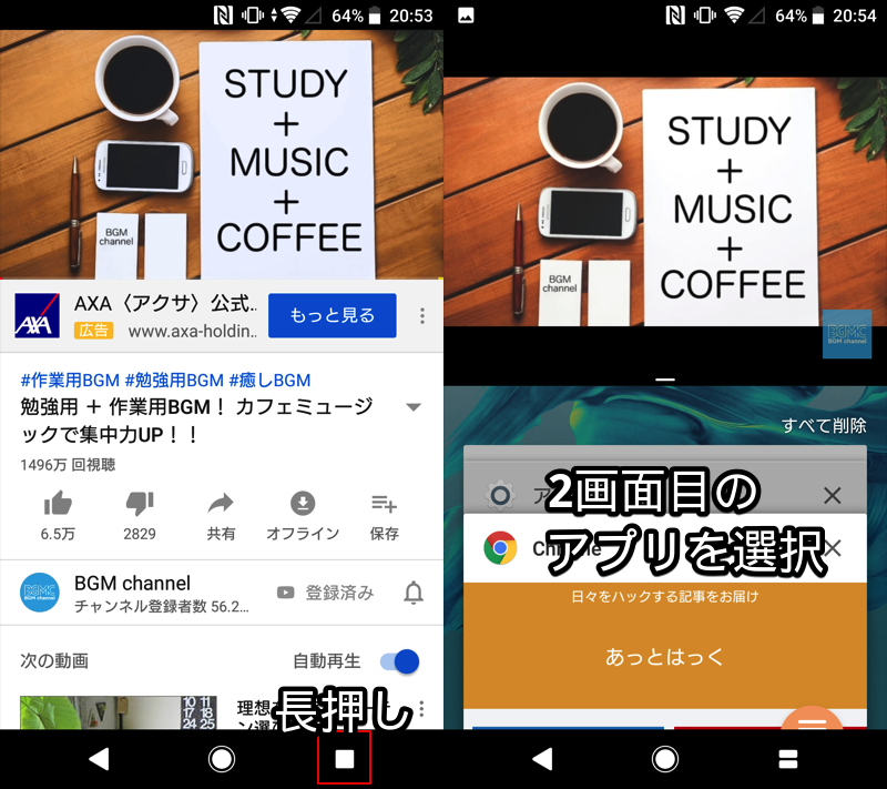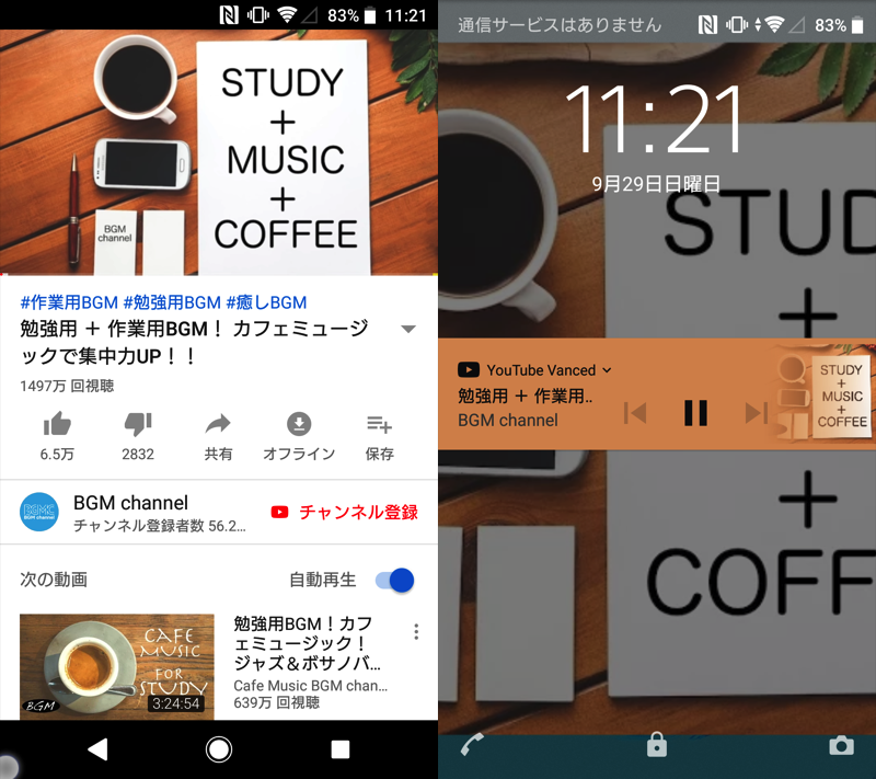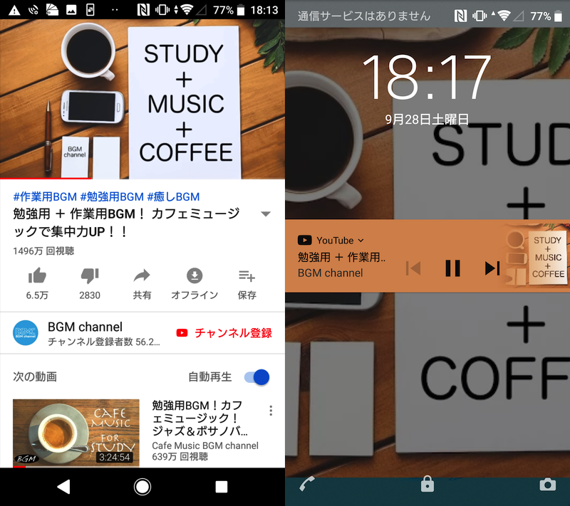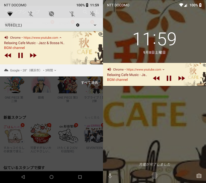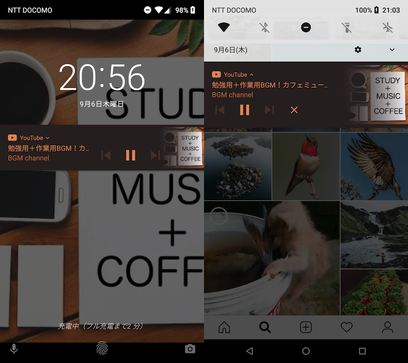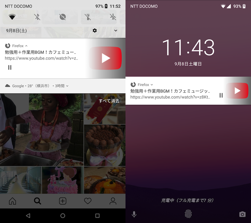 左边是显示 LINE 的示例,右边是锁屏后台播放 YouTube 的示例。