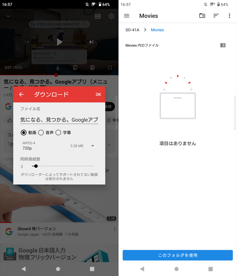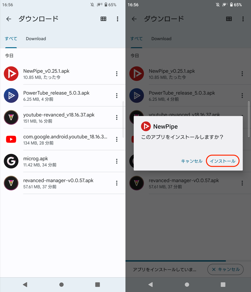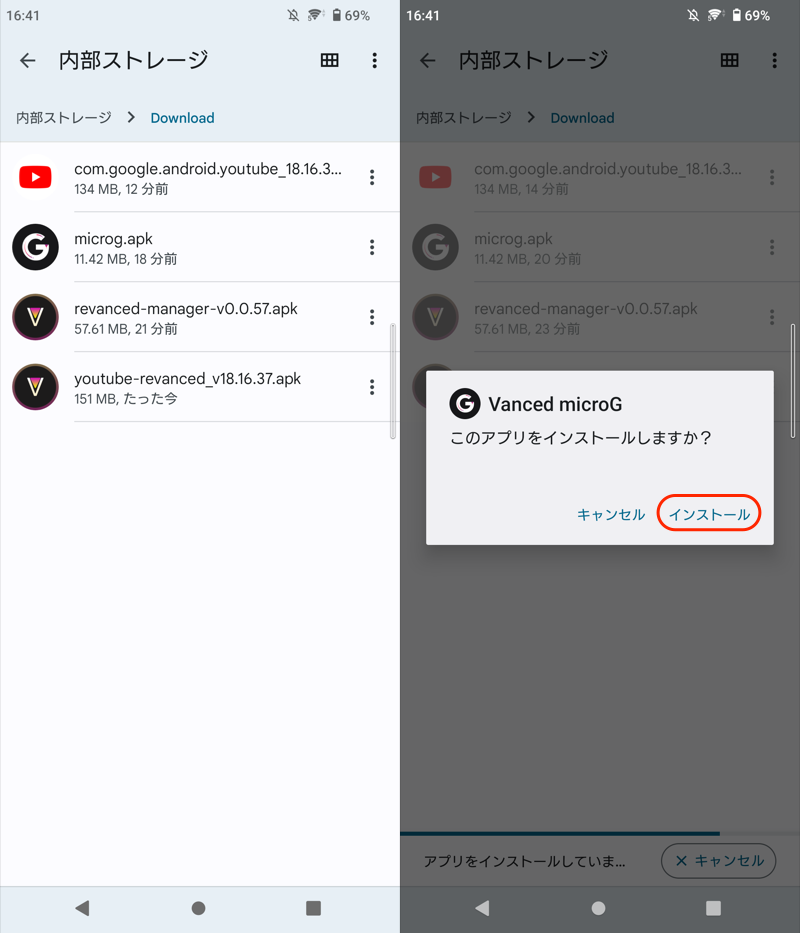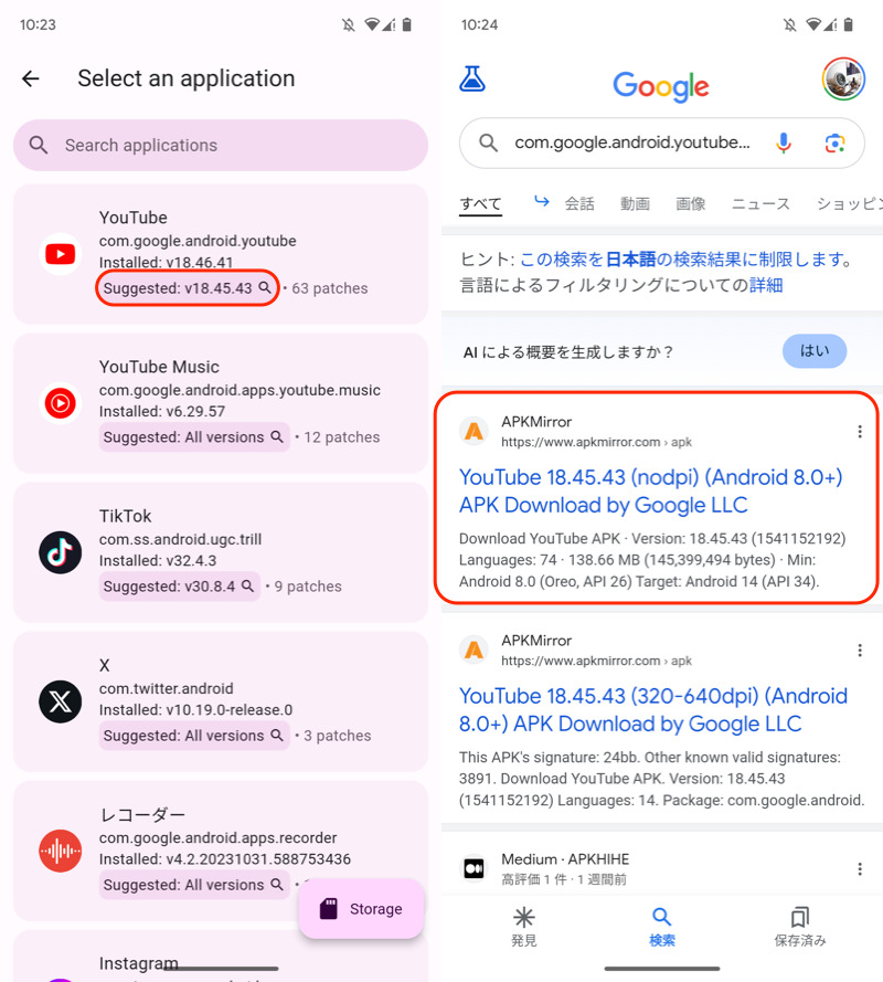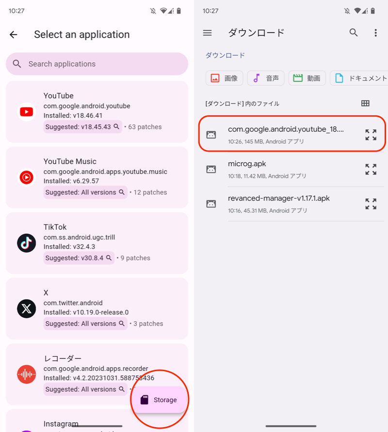 (左)选择应用程序→存储(右)选择准备好的YouTube apk