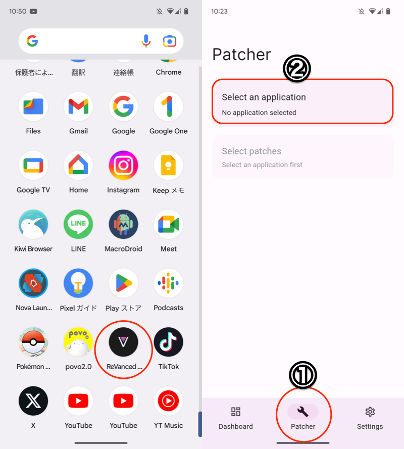 (左)打开 ReVanced Manager (右)①“Patcher”选项卡 → ②选择应用程序