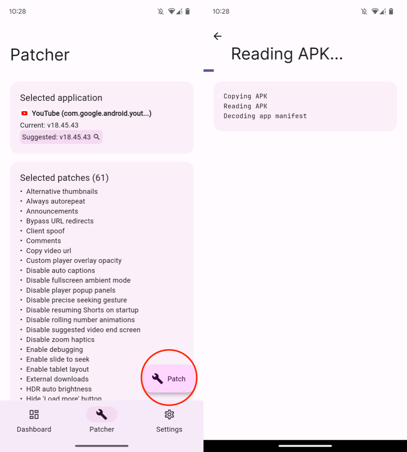 打开 ReVanced Manager 并转到“修补程序”选项卡。选定的应用程序→贮存并继续。